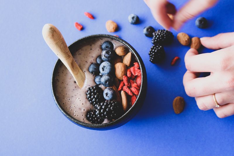 Семена чиа замочите в миндальном молоке и оставьте на ночь. После этого измельчите их вместе с остальными ингредиентами до консистенции густого йогурта. Украсьте свежими ягодами и подавайте на стол.